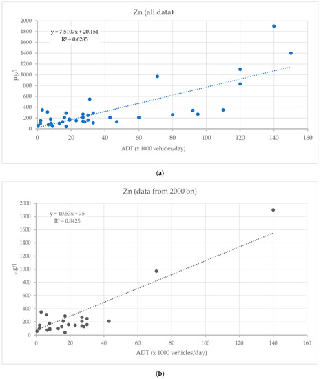 Zn concentrations in runoff from roads with various ADT (x1000 vehicles/day) for two groupings of measured data: (a) using all data (blue dots) from the StormTac Database, or (b) using only the data collected in 2000 and later (black dot).