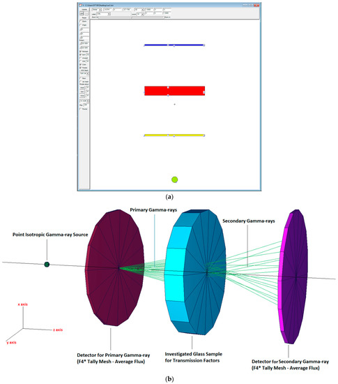 Along with basic gamma ray shielding characteristics, it is critical to evaluate the shielding materials’ specific attenuation capabilities when primary and secondary gamma rays are present. This method may offer critical information on the percentage of gamma rays transferred via shielding material. The term transmission factor (TF) [36] is a critical metric that may aid in finding the aforementioned values in order to acquire a better knowledge of the attenuation properties of shielding materials against ionizing gamma rays. The transmission factor (TF) of the examined glasses was estimated in this research utilizing the MCNPX [37] (version 2.7.0) Monte Carlo simulation code. The TF value assigned to a particular absorber was the radiation flux (F) ratio traveling through the material medium to the flux incident on the absorber’s surface. We calculated the TF of the examined glasses by dividing the mean gamma ray flux in the F4 tally mesh by the mean gamma ray flux in the uniform detection field. To convert this formulation into MCNPX code, two detection fields were positioned in front and behind the glass. While the intensity of primary gamma rays was measured in the detection zone just in front of the glass material, the intensity of attenuated gamma rays traveling through the glass was observed in the detection region directly behind the glass. Figure 1 illustrates the MCNPX simulation setup for the gamma ray transmission factor. The transmission factor (TF) measurement geometry was modelled using the code’s INPUT file as a first step in the simulation technique. The INPUT file of MCNPX is composed of three major components: a CELL card, a SURFACE card, and a DATA card. To start, we determined the CELL structures of the equipment by measuring their covering surfaces and densities. Additionally, the CELL card component also includes material IDs (Mn). Following that, the geometrical alignments of the surfaces for the TF configuration were entered, as well as their geometrical structures, which may be planar, spherical, or cone. We included radioisotope energies and the source geometry as a point isotropic source to the DATA card section. Hereby, it is worth mentioning that all the simulation studies were performed using Lenovo® ThinkStation-P620/30E0008QUS Workstation-1x AMD-Ryzen, Threadripper PRO Hexadeca-core (16 Core) 3955WX 3.90 GHz −32 GB DDR4 SDRAM RAM.
