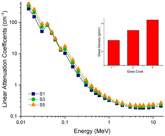 Variations of linear attenuation coefficient (cm−1) with photon energy (MeV) for all S1–S5 glasses.