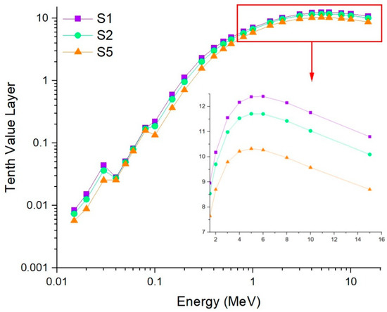 Variations of tenth value layer (cm) with photon energy (MeV) for all S1–S2–S5 glasses.