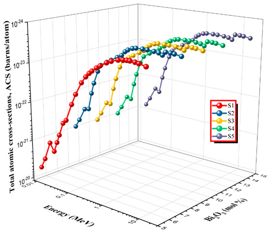 Variations of total atomic cross sections with photon energy (MeV) for all S1–S5 glasses.