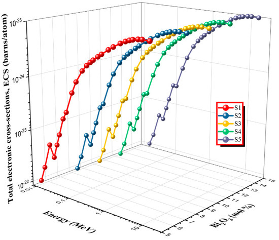 In order to evaluate the effective atomic number (Zeff) of the investigated glasses, the ACS and ECS values had to be computed as radiation shielding parameters. The variation of the ACS as function of the incident photon energy is shown in Figure 4, while the variation of the ECS is shown in Figure 5. From Figure 4 and Figure 5, it is seen that the ACS and ECS values decrease with increasing photon energy. In addition, the values of the ACS parameter are greater than that of the ECS parameter for all glasses. This may be attributed to the fact that the probability of total electronic interaction in any material of incident photons being lower than the probability of total atomic interaction.