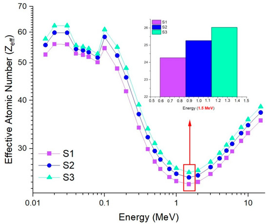 Variations of effective atomic number (Zeff) with photon energy (MeV) for all S1–S2–S5 glasses.