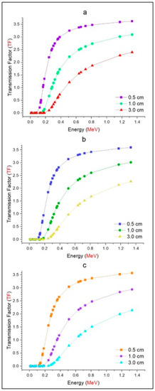 Transmission factors (TFs) of investigated glasses (a) S1, (b) S3, and (c) S5 as a function of used radioisotope energy (MeV) at different glass thicknesses.