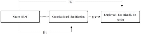 These paths can create a competitive edge in organizations that intend to support the sustainability cause, as the effects of pro-environmental behavior among employees as well as employees’ sense of organizational identification can provide benefits that are relevant to the urgent need to integrate sustainability into the objectives of the organizations’ HRM systems [48]. Therefore, it is proposed that GHRM practices increase organizational identification, which, in turn, will improve employees’ eco-friendly behavior, in line with Hypothesis 3.