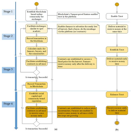 Activity diagrams on trust evolution in the proposed futures market. (a) Tasks required for trust establishment. (b) The achieved outcome in each stage.