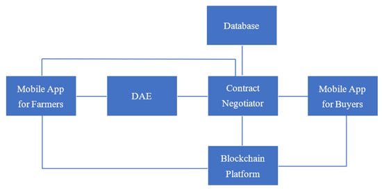 SAFM consists of six components: a mobile app for farmers, a mobile app for buyers, the Digital Agrifood Ecosystem (DAE), a Contract Negotiator Module (CNM), the Blockchain Network, and a database as depicted in Figure 3.