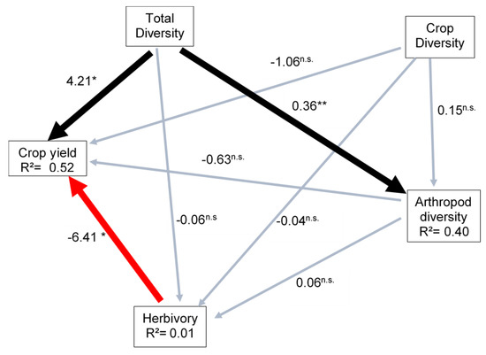 Structural equation model of the effects of plant diversity on crop yield, arthropod diversity and the negative effect of herbivory on crop yield in agroforestry systems. The thick black lines indicate positive relationships, the red line indicates negative relationships, and the gray lines non-significant relationships (n.s). * p < 0.05, ** p < 0.01. R2 is the proportion of variance explained.