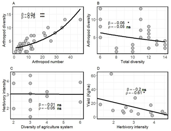 Effects of (A) arthropod abundance, (B) total diversity on arthropod diversity, effect of (C) crop diversity on crop herbivory intensity, and (D) the effect of herbivory intensity on crop yield. β is the slope of the regression and ρ is the Pearson correlation coefficient. Asterisks indicate * p < 0.05, *** p < 0.001 and ns: non-significant.