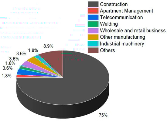 There were many fatal accidents during the working process caused by mobile cranes, and as the use of mobile cranes increases the types of industries in which accidents occur are classified, as shown in Figure 2. The results of this analysis show that the most common fatal accidents caused by mobile cranes occurred at construction sites, accounting for approximately 75% of the total deaths. However, it was found that more than 80% of accidents occurred when actual mobile cranes were used at public institution construction sites. This can predict the possibility of increasing usability due to the mobility and convenience of operating mobile cranes at construction sites. Nevertheless, this problem occurred because the workplaces employing accident-prone workers were not classified as construction businesses. To prevent such accidents, the special supervision and reinforcement of work using mobile cranes should be made not only at construction sites but also at similar types of work sites.