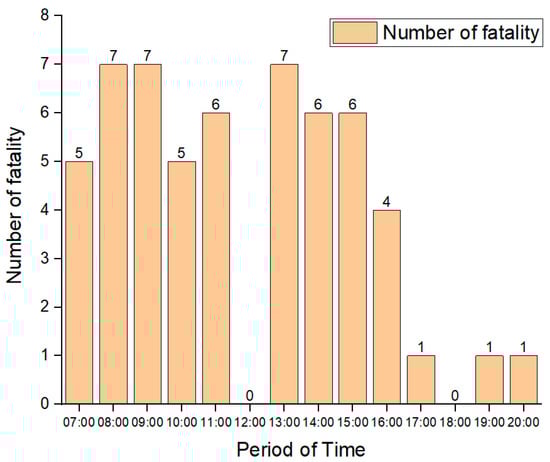 Figure 3 shows the time when a fatal accident occurred due to a mobile crane. The analysis is classified into one-hour increments from 7 o’clock, when work started. The analysis reveals that fatal accidents frequently occurred between 7:00 and 9:00, not long after work started, and between 13:00 and 16:00, when lunch was over and work was resumed. In the case of morning accidents, many accidents occurred when safety education was over and the routine began, but it seems that these accidents occurred due to a lack of safety education at the site. The figure also shows that many fatal accidents that occurred after lunch mainly took place due to a lack of awareness of safety accidents. To reduce the safety accidents caused by mobile cranes, thorough and field-oriented safety training before starting work should be provided.