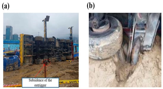 While lifting materials with a mobile tower crane at the Busan Opera House construction site, the equipment fell and collided with the ground due to the subsidence of the outrigger supporting the crane, causing a fatal accident. The accident occurred in 2019, resulting in fatalities and injuries. The following problems were derived through the accident investigation, as shown in Figure 5: