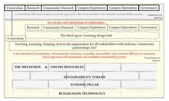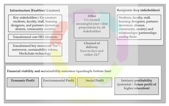 To that end, the present paper introduces the Blockchain Business Model for Higher Education (BBM-HE). The BBM-HE is a post-pandemic higher education (HE) business model that takes a modified business model canvas (BMC) perspective [18] and habituates several elements of the Higher Education Sustainability First System (HESFS) [19] in addition to accommodating other contemporary concepts, such as blockchain technology (BT), the metaverse, tokenization, the learning designers bridging academic and professional domains [20], and remote learning modalities, to the present educational climate. Its multi-theoretical foundation rests on self-regulated learning (SRLG) [21], empowerment [22], stakeholder theory with a co-creation framework [23], and sensemaking [24]. Furthermore, the BBM-HE is “adaptive” in nature, in that it harmonizes all the core elements (education, research, campus outreach, campus operations, community outreach) of the sustainable university as explained in [25], and the entire HEI itself with findings of the content analysis conducted in this study.