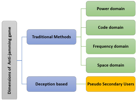 In recent years, game theory has been extensively used to model the dynamic interaction between legitimate users and the jammers. The dimensions of anti-jamming games are power domain [14], code domain [15], frequency domain [16,17], space domain [18] as shown in Figure 1.