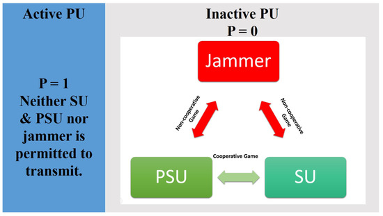 A triangular anti-jamming deception game is presented between SU, PSU and the jammer in the absence of PU as shown in Figure 2, indicating a cooperation in the form of light green arrow between all SUs and the PSUs.