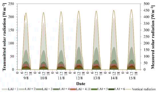 Solar radiation transmitted through the green layer simulated for the different LAI values (primary axis) and measured value of solar radiation on vertical surface (secondary axis), 9–15 August 2020.