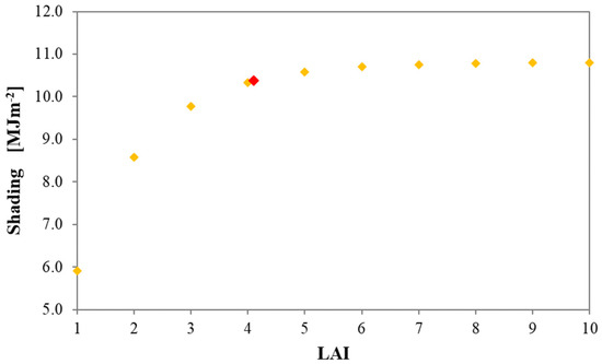 Daily average values of the solar shading effect of the green layer for different LAI values, 9–15 August 2020. Real configuration of the experiment (LAI = 4.11) is represented with a red diamond.