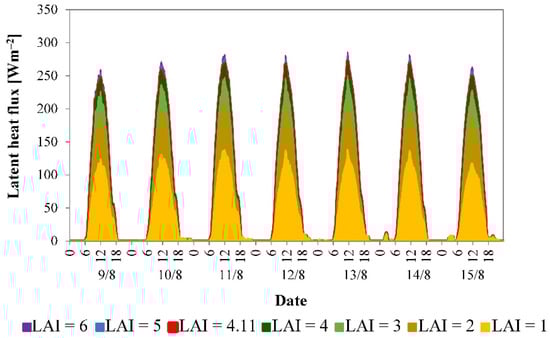 Latent heat flux due to evapotranspiration of the green layer with different LAI values, 9–15 August 2020.