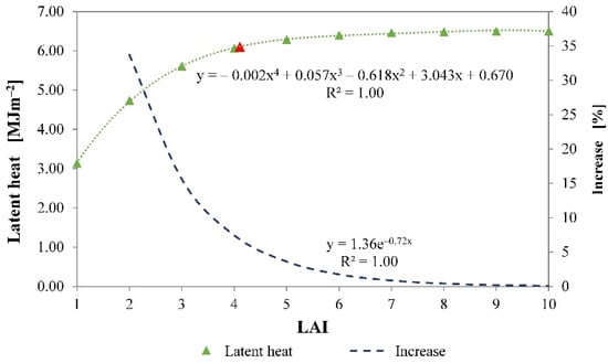 Latent heat due to the GL evapotranspiration was quantified by applying Equation (1) to the measured data of the analysis period. It was obtained an overall latent heat loss equal to 48.8 MJ m−2 in the period and an average daily value of 6.1 MJ m−2. The latent heat loss was, then, simulated for the other LAI values (Figure 4). As for the SS effect, latent heat loss increases when LAI rises. This behavior could be described by a polynomial profile with a R2 equal to 1.00 (Figure 5). The evaluation of the latent heat percentage increases, associated to LAI increases, highlighted a perfectly exponential trend (R2 equal to 1.00). Furthermore, as for the SS effect, the highest rise in latent heat loss (33.73%) was recorded for LAI going from 1 to 2 (Table 1). When LAI becomes higher than 6, the increase of this cooling mechanism is lower than 1%.