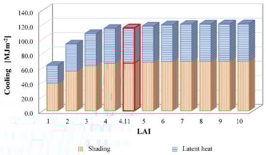 Overall cooling effect as combination of shading and latent heat exchange for the different LAI values, 9–15 August 2020. Real configuration of the experiment (LAI = 4.11) is represented with a red outline.