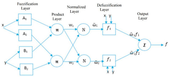 where the As and Bs are the membership functions of the two inputs x and y, respectively. However, the final output f is calculated based on the two rules’ outputs, f1 and f2, as follows: