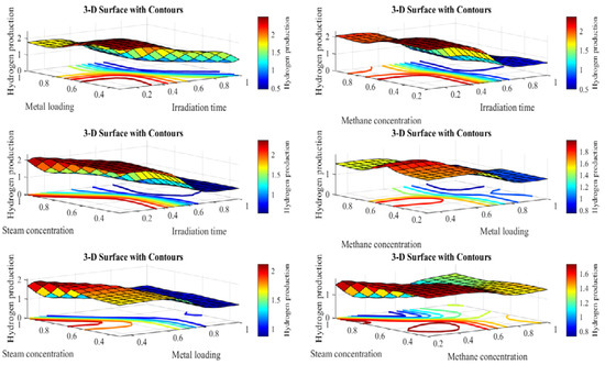 Figure 4 shows the spatial representation in 3D view with contours of the system’s input–output function with every two inputs at a time. The highest value of the output went towards the dark red, while the lowest value went towards the dark blue. As it can be seen from the figure, the increase in the steam concentration had a positive effect on hydrogen production. This could be due to the role of the steam in the reforming process. Around 20% methane demonstrated the highest hydrogen productivity. This could be related to the possible carbon deposition at higher methane concentrations, and insufficient methane at lower concentrations [33]. Higher loading of the metal, i.e., more than 2 wt% of La over TiO2, had a positive effect on the hydrogen production, which could be related to the better morphology, higher surface area, and higher pore volume of the samples with higher metal loading [31]. It also showed that an intermediate irradiation time of around 60 min was the best in terms of hydrogen production.