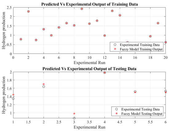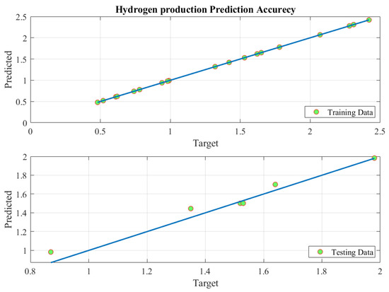 Capturing the exact relation between hydrogen production and the four controlling inputs encouraged the ANFIS model to predict the performance correctly. This was clear from the plotting of the fuzzy model’s predicted outputs versus the experimental data in the cases of training and testing phases, as shown in Figure 5. The close matching between the experimental data points and the model’s results could be noticed clearly, especially for the testing dataset. Additionally, the predictions’ plots around the one-hundred percent accuracy line are shown in Figure 6 for both training and testing stages.