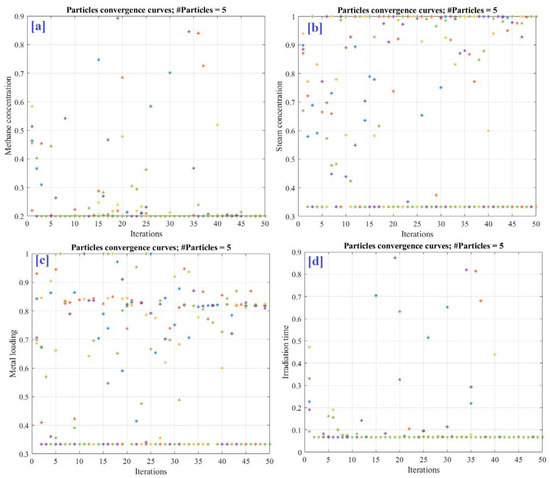 For more understanding of the behavior of the agents throughout the searching process in the SMA algorithm, Figure 8 shows the distribution of the four components of the proposed five solutions at every iteration. Every component represents one of the unknown variables. Figure 8a illustrates the convergence curve of the output while Figure 8b–d shows the convergence curves of the controlling variables obtained using SMA.