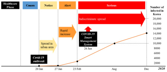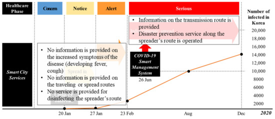 Smart city services use IT to solve urban problems related to the environment, traffic and disasters. However, these services face limitations in responding to large-scale disease outbreaks, such as COVID-19. As mentioned in Section 2.2.2, the primary limitation stems from the lack of flexibility in the smart city structure. To verify this postulate, a COVID-19 scenario, as shown in Figure 4 COVID-19 Scenario: Outbreak of COVID-19 in Korea was assumed, in combination with the healthcare system visualized in Figure 3. Healthcare system phase with time series. The COVID-19 scenario in Figure 2 is based on the window of the COVID-19 outbreak (January 2020–September 2020), number of patients and healthcare phases in Korea [69].