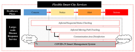 By launching the COVID-19 Smart Management System, Korea proved that new services could be established by integrating essential functions with existing smart city services [70,72]. However, the system could not serve other functions, except the automatic analysis of confirmed patients’ paths of movement [15]. Therefore, the creation of a structure that can respond to infectious diseases even in the earlier phases (concern, notice and alert) remains imperative.