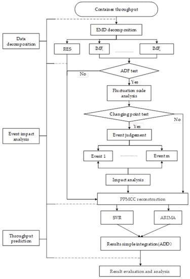 To explore the impact of COVID-19 on port container throughput and improve the forecasting accuracy, a decomposition–ensemble methodology is proposed based on event analysis. This method actually improves the existing decomposition–ensemble technology in the framework of “divide and conquer” [40]. By incorporating EMD and a forecasting model, the event analysis and forecasting are integrated into a dual-function hybrid model.