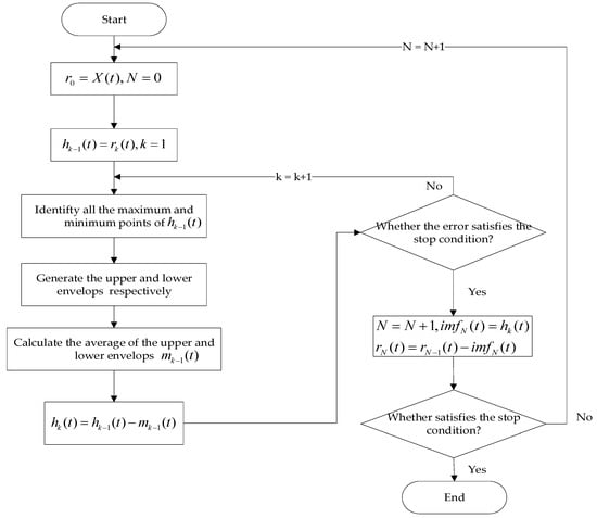 The EMD decomposition flow is presented in Figure 2. The original time series data can be expressed as follows [31]: