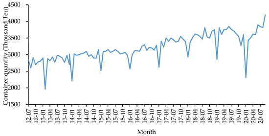The International Maritime Organization (IMO) reported that maritime transport accounts for more than 90% of global trade, which indicates that shipping is the dominant mode of transportation in global trade [44]. This empirical analysis is based on the monthly throughput data of Shanghai port from July 2012 to October 2020, as shown in Figure 3.