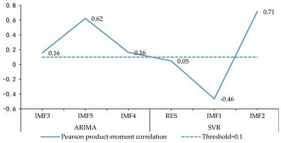 To reduce the observation by reducing the components, we use the Pearson product–moment correlation coefficient to calculate the contribution rate of each intrinsic mode component for component reconstruction, where all intrinsic mode components are evaluated by selecting the appropriate evaluating indicators. It can filter out high-frequency noise and trend terms. Considering the great differences between modes in this paper, the contribution rate threshold value is set to 0.2 (generally 0.01), as shown in Figure 5.