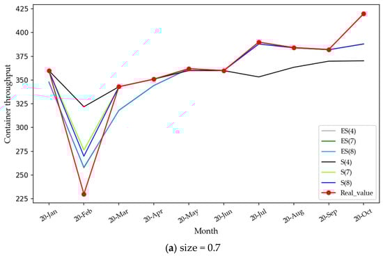 To eliminate the influence of training size and verify the reliability of taking value , so as to enhance the interpretability and generality of the research, we will use the SVR model (E-S, SVR) to carry out a comparative experimental analysis under different training sizes and conditions. The value is determined according to the mixed-event analysis model. The experiment will be divided into two parts: experimental verification and experimental result analysis. In this paper, the E-S (EMD-SVR) and SVR models will be used to predict the above data in different training sizes and different lag periods . The results are shown in Figure 7.