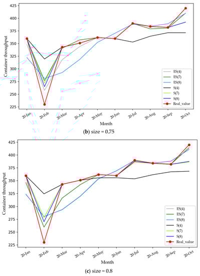 In this section, the non-stationary mode IMF1, and the mode IMF2 with change points, are predicted by the SVR model, while the reconstructed model IMF3 is predicted by the ARIMA model. Firstly, we set the range of the SVR optimal parameter combination as . In the ARIMA model, the optimal model of each training sample determines the optimal value of parameter by minimizing the BIC criterion (Bayesian Information Criterion). Then, the EEAS (EMD-Event Analysis-Arima-SVR), E-S (EMD-SVR), SVR, and ARIMA models are used to predict port throughout from January 2020 to October 2020. The selection of the SVR forecasting lag period is defined according to the event analysis results. In the previous section, we obtained an impact range of 4–6 months; therefore, in order to avoid the impact of change points on the forecasting model, we set the lag period as and compare the forecasting performance with other forecasting technologies. The forecasting performance of different models is shown in Table 7.