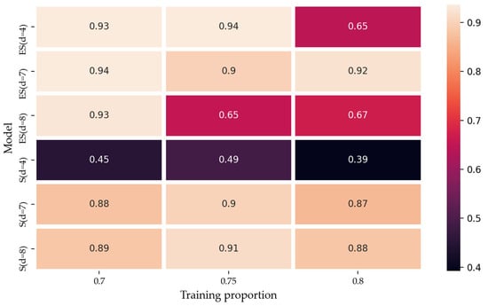 In Figure 8, the darker the color, the smaller value and the worse the forecasting performance. In Figure 8, when , no matter how the size changes, the accuracy coefficient is very high. This means that the consistency between the predicted value and the real value is very high. The accuracy coefficient of the forecasting model with is lower than which indicates that the forecasting performance of the forecasting model will change greatly when the training size changes. Therefore, the forecasting effect when is not affected by the training size, and the efficiency is better than that when . It is concluded that the data lag period , defined by the event analysis, makes the SVR model less vulnerable to the influence of training size, thus improving the overall forecasting performance.