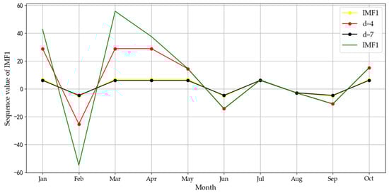 In Figure 9, the fitting degree is the worst under the scenario when (yellow and black), and the fitting degree when (red) is very good. Among themare the control parameters, and is selected by the analysis results in Section 3. Considering that IMF1 is composed of non-stationary data, the selection of lag period will effectively improve the forecasting accuracy of non-stationary mode data and is not easily affected by the change of training size.