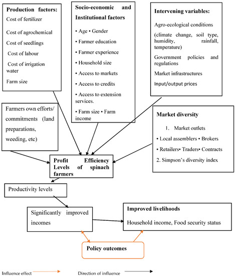 The socio-economic and institutional factors, farmers’ efforts, and intervening variables were factors influencing farmers’ efficiency. The profit efficiency and its influencing factors influence policy decisions. The policy decisions play an important role in providing feedback effect to spinach farmers in enhancing profit efficiency and profit levels. The enhanced income and food security levels of spinach farmers affect profit efficiency and its determining factors through the improved and informed use of inputs.