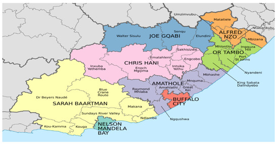 - Eastern Cape Development Corporation (ECDC). About the Eastern Cape: District Maps. 2013. Available online: http://www.ecdc.co.za/the_eastern_cape/district_map (accessed on 15 May 2021).