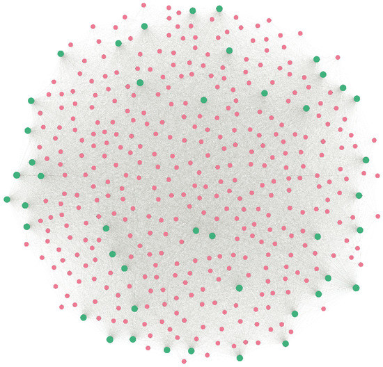 TSNA of all sectors in Calabria in 2019. Pink nodes = sectors, and green nodes = LMAs.