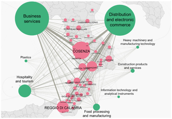 TSNA Education and knowledge creation cluster in Calabria in 2019. Pink nodes = LMAs, and green nodes = sectors. The size of the LMA node reflects the total no. of units in all sectors found in that LMA, whereas the sector’s node size is the aggregated no. of establishments in the corresponding sector. Edge’s width is no. of units in each sector in the connected LMA.