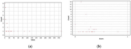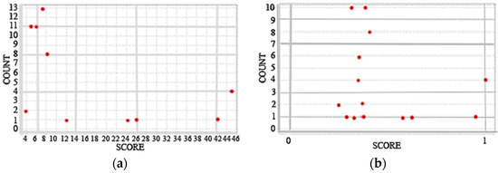 In this experiment, the green nodes’ (the clusters) sizes are proportional to the number of establishments. In other words, it is the size of the cluster in the region—the line weight advocates the cluster’s number of establishments in the connected LMAs. As expected, although the well-known LMAs (Cosenza and Reggio Calabria) are engaged proportionally to their influential position, this model highlights that other medium-size LMAs are playing relatively positive roles. Lamezia Terme, Catanzaro, Vibo Valentia, Crotone, and Castrovillari establish reliable connections to the region’s main active clusters, respectively (Figure 5). The degree of distribution (Figure 6a) highlights that there is a large number of LMAs with less than 12 connections (meaning less than 0.01% of the possible number of links). As a result, there is a geographical disparity in which these dominant LMAs mentioned earlier absorb a significant number of opportunities. The sparsity of the network due to its low density (20%) demonstrates the weakness of the economic structure.