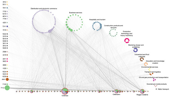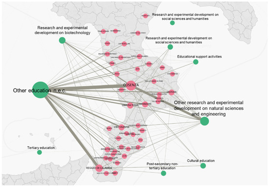 This process’s first level (intra-cluster perspective) results include 45 interactive network nodes highlighted in red, while nine of the “Education and creation” cluster sectors are demonstrated in green. At first glance, it is essential to mention the core/periphery network formation level in both levels. It is clearly shown that the critical cities play a significant role in the education knowledge diffusion, while the small share of the others is neglectable. More in detail, we can mention the degree of connection between “Other Education Means”, which primarily relies on the private universities and training centres and the two main hubs of the Calabria region. To be more precise in this result, we can group the territory into two vividly separated boundaries where Cosenza and Reggio Calabria, as the primary hosts of the Calabrian Universities, are located. Not only university studies but also the research sector are both complicated/knowledge creation software is well connected to them; however, the Cosenza has a strong connection even with other components of the “Education and creation” cluster.