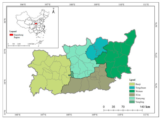 The Guanzhong region is situated within Shaanxi Province (Figure 1). To enable the merging of social statistics with data on ecosystems, county administrative boundaries were used to clarify how the data were applied our study area, which focused on Xi’an, Xianyang, (Yangling), Baoji, Tongchuan, and Weinan. The region is located between 33°35′ and 35°51′ north latitude and between 106°19′ and 110°36′ east longitude. Topographically, the Guanzhong region is a basin located between the Qinling Mountains and the Loess Plateau. LUCC, known as Land Use Cover Changes, can be classified into six categories in Guanzhong: arable land, forest land, grassland, waterbody, construction land and unused land, and these six LUCC categories are the main types of land use in this area. Here, the terrain is high in the east and low in the west. Further, the Weihe River, running through the central region, forms a large alluvial plain area (Figure 2). The Guanzhong region with semi-humid climate is a warm temperate region with four distinct seasons and a wide diversity of vegetation types and agricultural types. Economically, the region is at the heart of the economy of Northwest China and Shaanxi Province, where it plays an important role in the strategy of western development. With rapid economic development, it has also experienced a great growth in population.