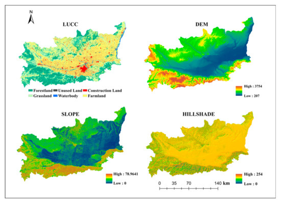 Natural environment layer (LUCC is land use type (2015), DEM is digital elevation model, SLOPE is slope obtained through DEM, and HILLSHADE is mountain shading obtained through DEM).