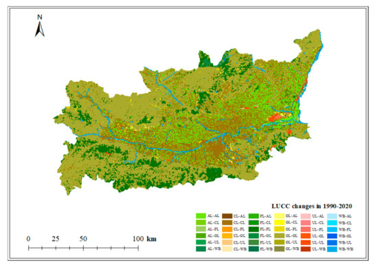 From 1990–2020, the areas of construction land, cropland, grass land and forestland experienced significant changes (Table 2 and Table 3 and Figure 3). Arable land decreased the most, reaching 169,470.28 hm2, but remained the main type of LUCC. Construction land increased the most (144,760.51 hm2) with the acceleration of urban-rural integration. The flow for construction land was the most intensive and occupied 1529.64 hm2 of arable land during the 30-year period.