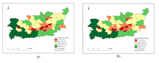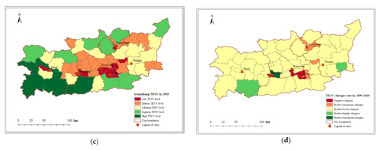 According to the calculation of Natural Jenks using ArcGIS 10.2 software, the total ESV (TESV) was classified into five classes (Figure 4). The spatial pattern of TESV in each administrative region maintained an increasing “center-periphery” circular distribution from low to high during the 30-year period (Figure 4a–d). Spatially, the TESV in the periphery was high in the west and low in the east. Xi’an City and Yangling Development Zone exhibited a negative variation, while the rest displayed positive variations.