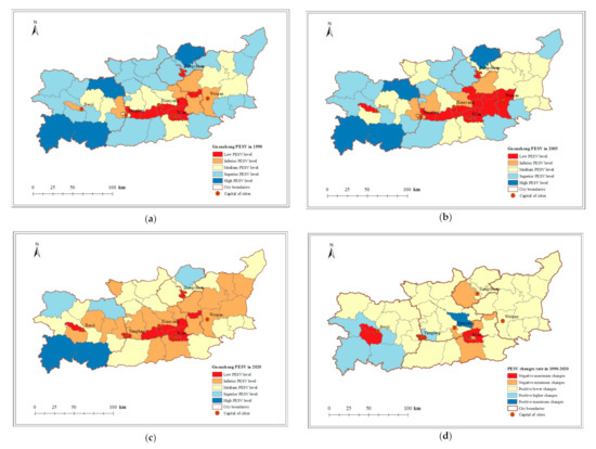 To further explore the influence of demographic factors on the distribution of ESV, the spatial variation of per capita ESV (PESV) was calculated (Figure 5a–d). The results suggest that the PESV also displayed spatial variation characteristics centered on Xi’an, maintaining a progression from low to high from the interior to the periphery (Figure 4), which is in accordance with the distribution of the TESV. Among five cities, Baoji maintained the highest PESV, while Xi’an maintained the lowest. Moreover, Baoji exhibited the largest proportion of positive PESV change, while Xi’an displayed more negative PESV changes, which were mainly from the main urban area.