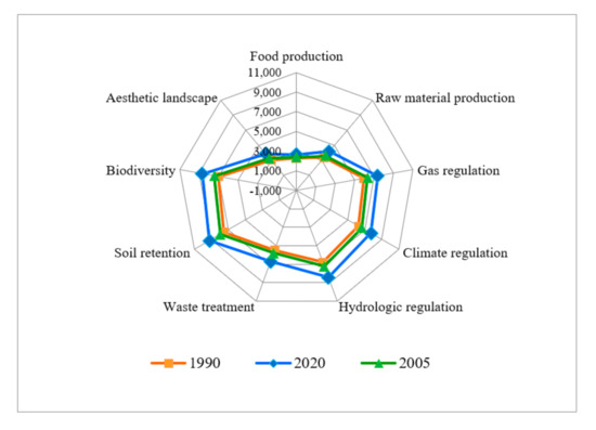 Dividing the four service types into secondary subdivisions, ESV changes are shown in Figure 4. Overall, hydrological regulation, biodiversity and soil conservation were the main ESV types among all ESVs. The ESV of soil conservation increased from 7521.43 × CNY 106 in 1990 to 9221.8 × CNY 106 in 2020 and reached the highest value; while the ESV of food production was always lower than the other ESV categories, maintaining a range of 2246.68 × CNY 106– to 2664.58 × CNY 106.